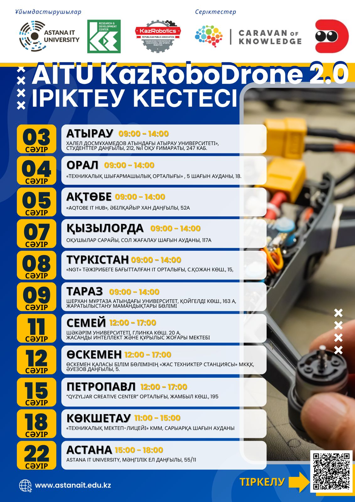 «Astana IT University» ЖШС, «Қазақстан инжиниринг» ҒЗТКЖ орталығы» ЖШС және «KazRobotics» спорттық және оқу робототехникасы Қазақстандық федерациясының ұйымдастыруымен және Caravan of knowledge, «Drone.KZ» қолдауымен конкурс жариялайды!
