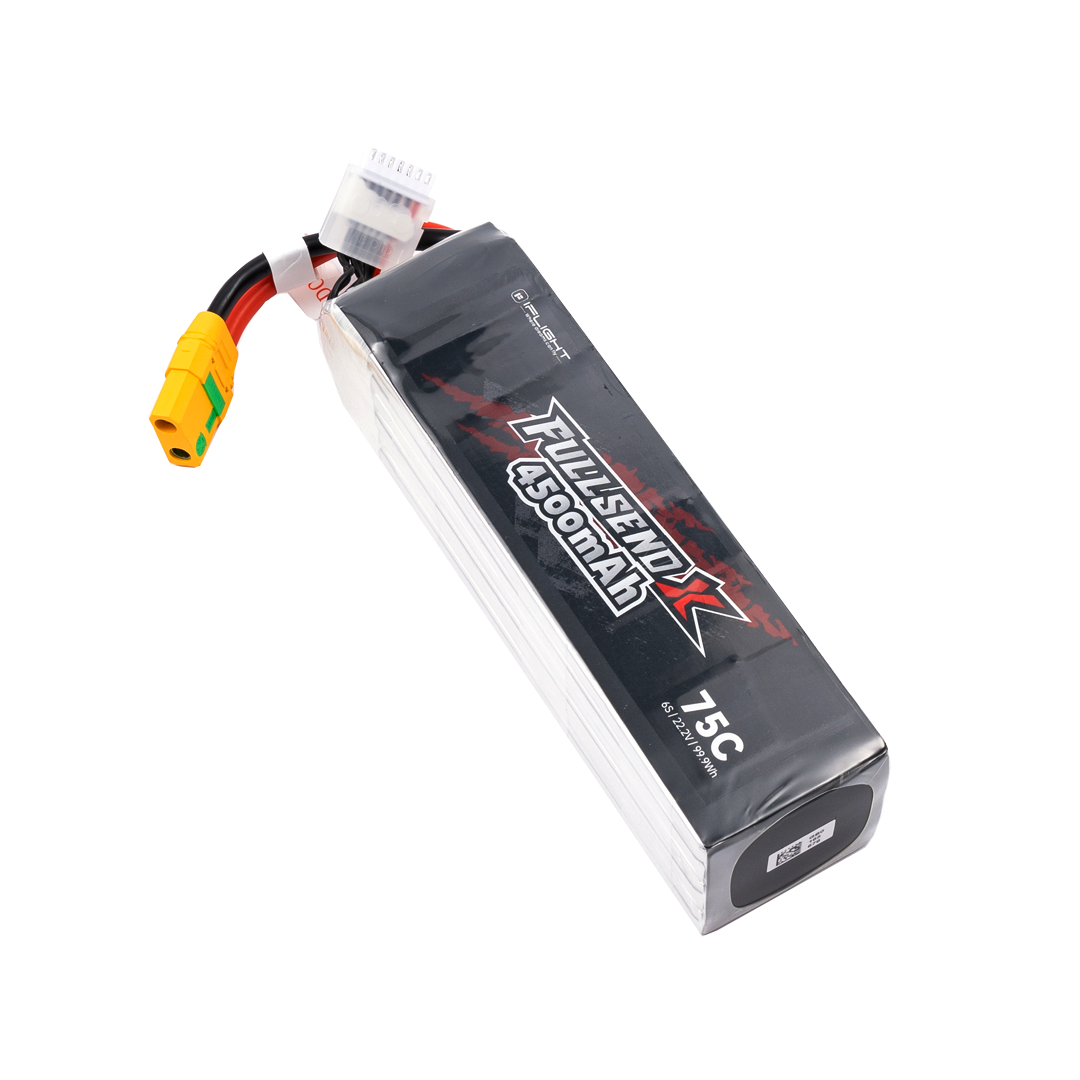 Для коптера рекомендуется полётная батарея Fullsend 6S 4500mAh. которая обладает максимально возможной плотностью хранения энергии при минимальном весе и большим током отдачи без просадки напряжения на экстремальных режимах. Такие характеристики придадут дрону максимальную энерговооруженность даже с установленной тяжелой камерой и позволят совершать эффектные динамичные пролеты, мгновенно реагируя на все возникающие препятствия.