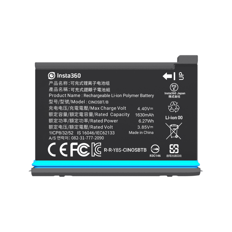 Аккумулятор Insta360 One X2 изготавливается с надежным корпусом из прочного пластикового полимера. Окрашен в матовый черный цвет. Среднее время полной зарядки составляет 90 минут. Предусмотрен эластичный резиновый уплотнитель, защищающий от попадания влаги. Встроены две застежки для надежной фиксации в корпусе видеокамеры. Подходит для портативных устройств серии ONE X2.