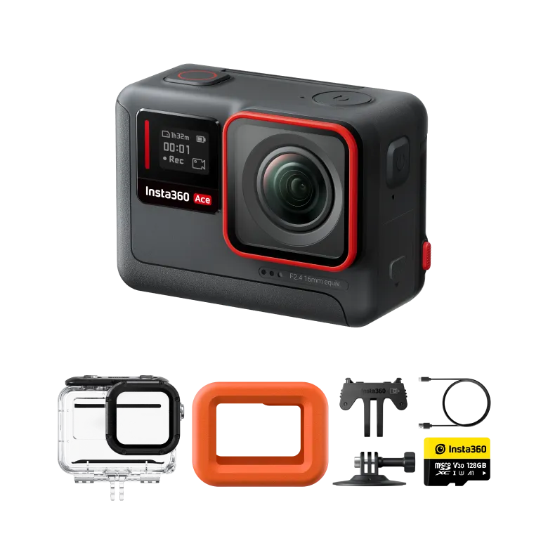 Комплектация | Экшн-камера Insta360 Ace Splash Kit / Аккумулятор 1700mAh Battery x 1 / Маунт Flexible Adhesive Mount x 1 / Крепление Standard Mount x 1 / Кабель Type-C to C Cable x 1 / Карта памяти 128GB microSD Card x 1 / Кейс-поплавок Float Guard x 1 / Аквабокс Ace Pro Dive Case x 1 / Руководство |