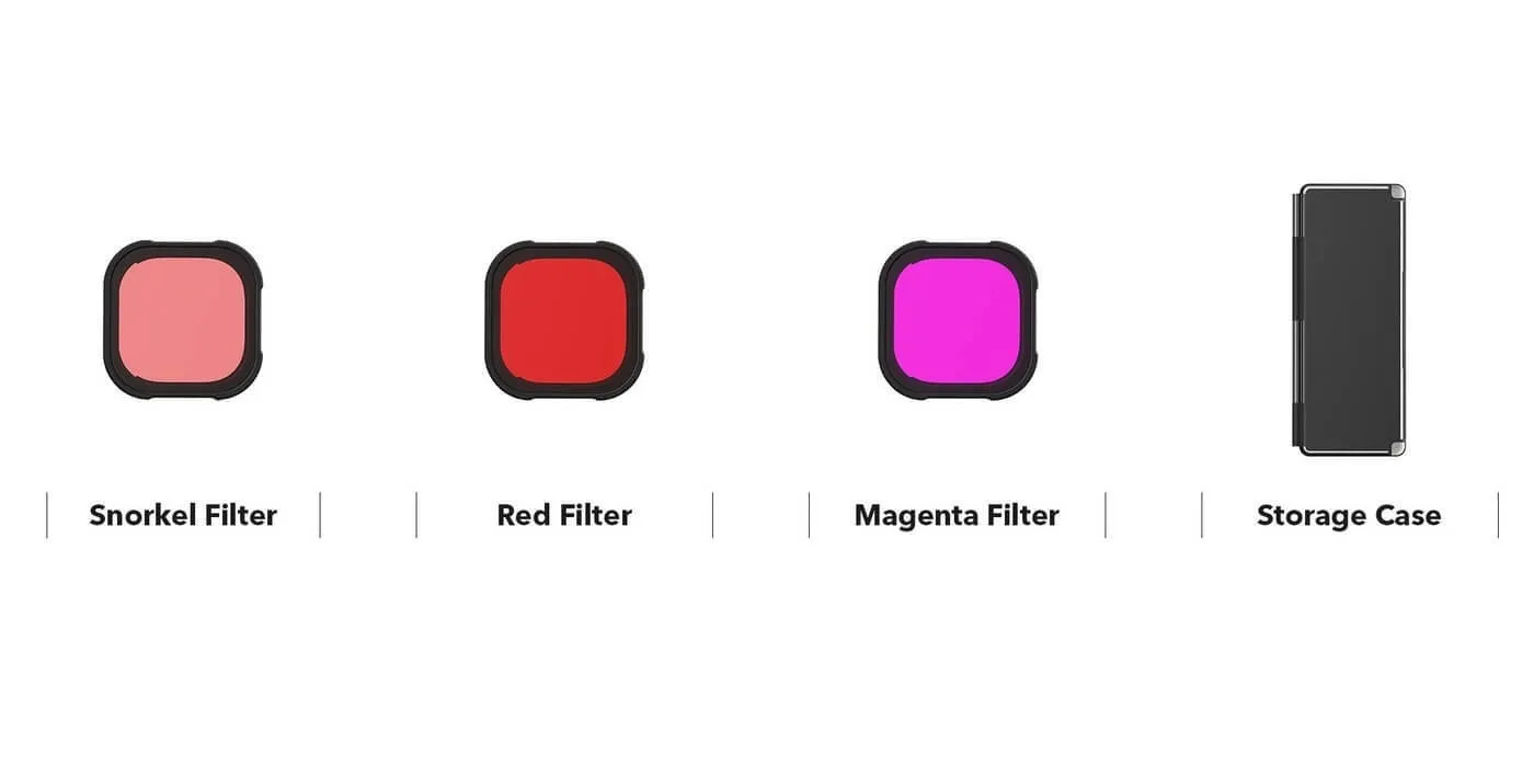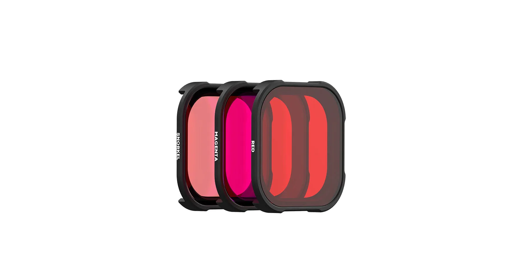 | Дополнительные возможности | Red (красный) Обеспечивает цветокоррекцию на глубине 4,5 – 24,5 м / Magenta (пурпурный) Незаменим при съемке в зеленой воде пресных и соленых водоемов, на глубине 3 – 23 м / Snorkel (для снорклинга, розовый) Подойдет для создания кадров в мелководье, на глубине 0,5 – 4,5 м |