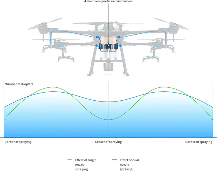 Дополнительные возможности | Сферический всенаправленный радар обнаружения препятствий: Модель RD2418R / Система облета препятствий: диапазон определения высоты: 1–30 м / Точность зависания (хороший сигнал GNSS) D-RTK включен: по горизонтали ± 10 см / по вертикали ± 10 см / Точность зависания (хороший сигнал GNSS) не включен D-RTK: по горизонтали ± 0,6 м / по вертикали ± 0,3 м (функция радара включена: ± 0,1 м) / 2 прожектора: интенсивность света 13,2 лк на расстоянии 5 м, по прямой / Взлетный вес на уровне моря 42,6 кг / Рабочий объем бака: 20 л / Производительность (в час) 12 га / Модель сопла: SX11001VS (стандартное) SX110015VS(опциональное) XR11002VS(опциональное) / Макс. скорость распыления: SX11001VS: 3,6 л/мин / SX110015VS: 4,8 л/мин XR11002VS: 6 л/мин / Размер капель: SX11001VS: 130–250 микрон / SX110015VS: 170–265 микрон XR11002VS: 190–300 микрон (зависит от реальных условий работы, напора распыления и т. д.) / Ширина распыления: 4–7 м (8 сопел, высота 1,5–3 м над посевами) / Расходомер высокой точности, погрешность ± 2% / Управление несколькими машинами: до 3 дронов / Ультраяркий дисплей 1,920×1,080 |
