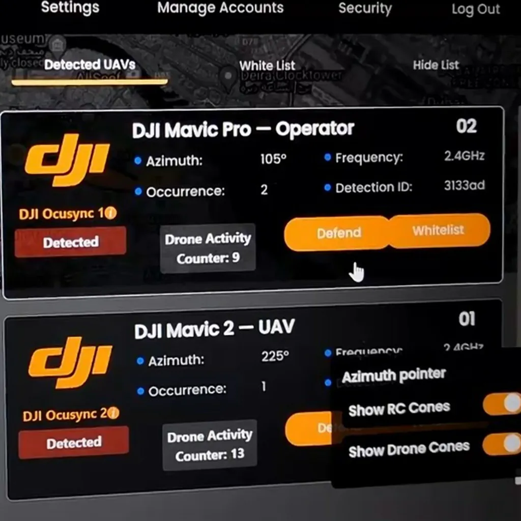 | Дополнительные возможности | Полный охват воздушного пространства на 360 градусов / Возможность интеграции детектора дронов для автоматизированной работы / Радиус действия до 8 км / Диапазоны частот 433 МГц, 868 МГц, 915 МГц, 1,2 ГГц, 1,5 ГГц, 2,4 ГГц, 5,2 ГГц и 5,8 ГГц / Имеет расширенные возможности IFF (идентификация «свой-чужой») для точной оценки угрозы |