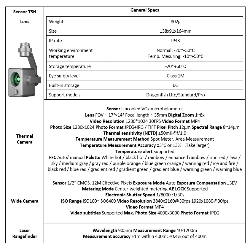 | Сенсор | Wide Camera: 1/2" CMOS/Thermal Camera: Uncooled VOx Microbolometer |