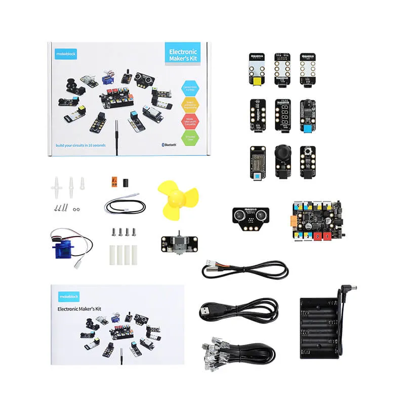 | Комплектация | Комплект Makeblock Easy-Play Electronic Programming Maker's: / 1 × контроллер Me Orion / 1 × датчик движения Me PIR / 1 × датчик звука Me / 1 × светодиод Me RGB / 1 × джойстик Me / 2 × кабель 6P6C RJ25-35 см / 1 × кабель 6P6C RJ25-50 см / 1 × Me 7 -сегментный дисплей-красный / 1 × Me Light and Grayscale Sensor / 1 × Me 130 DC Motor Pack / 1 × Me Bluetooth Module (Dual Mode) / 1 × Me Ultrasonic Sensor / 4 × кабель 6P6C RJ25-20 см / 1 × держатель батареи для (6) AA / 1 × 9g Micro Servo / 1 × адаптер Me RJ25 / 1 × датчик температуры Me / 1 × кабель USB 2.0 A-Male to Micro B-Male / 1 × потенциометр / Руководство |