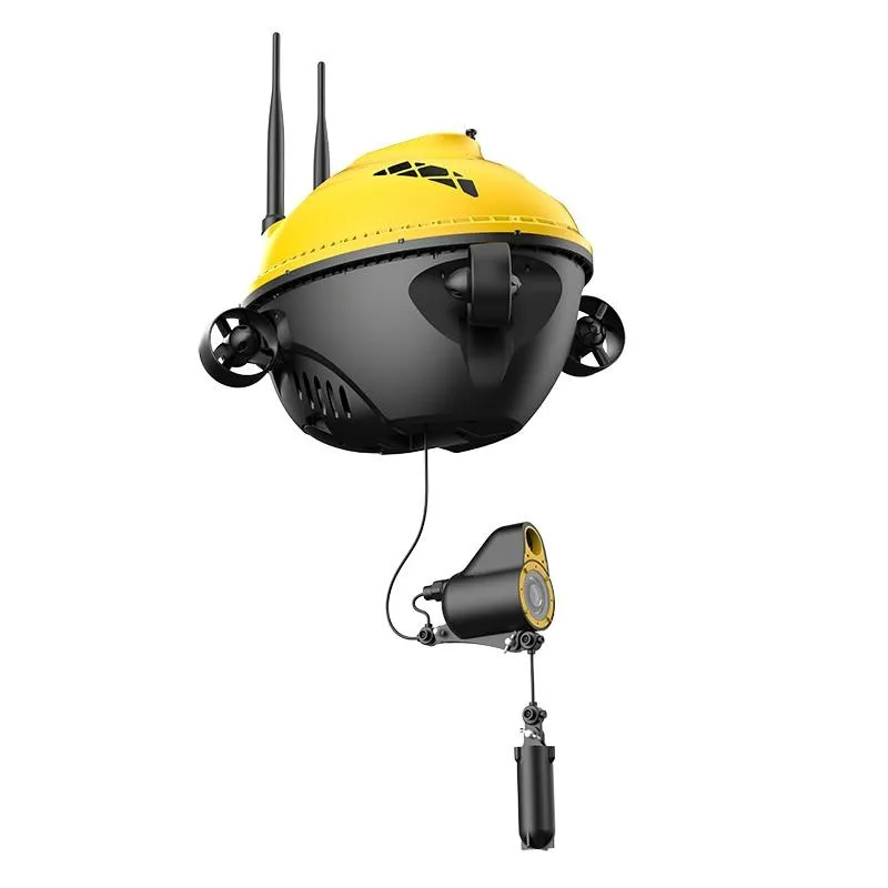 Благодаря инфракрасной подсветке камера отлично снимает даже в плохих условиях. Вы можете получить невероятные кадры даже во время съемки в темной воде. Дальность видимости камеры составляет 1 метр. Управление дроном производится с помощью специального пульта. Кроме того, модель поддерживает возможность управления камерой, поднимая и опуская ее. Дрон может погружаться на глубину до 28 метров. Этого достаточно для поиска рыб и отслеживания перемещения стай.