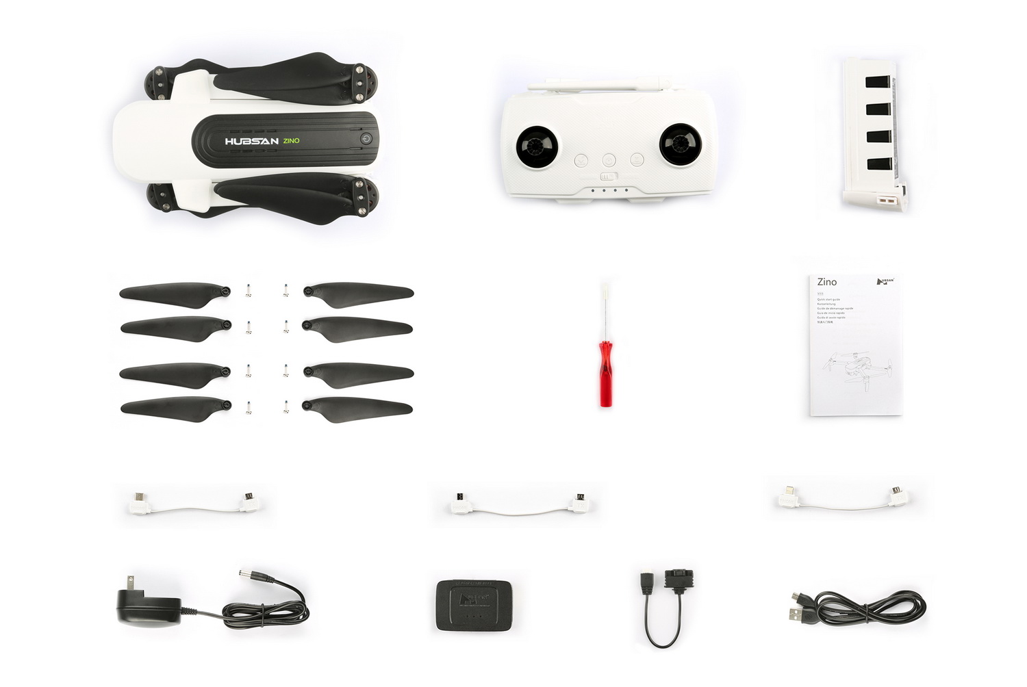 | Комплектация | Квадрокоптер Hubsan ZINO / Пульт дистанционного управления / Аккумулятор / Пара пропеллеров, 2 шт. / Зарядное устройство / Блок питания к зарядному устройству / Переходник к зарядному устройству / Кабель для сопряжения смартфона с пультом, 3 шт. / USB-кабель для сопряжения дрона с ПК / Отвертка / Руководство пользователя |