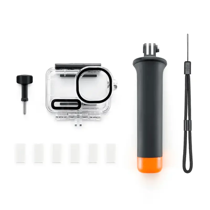 В состав DJI Osmo Action 6 Diving Kit входит прочный водонепроницаемый чехол, который защищает камеру от давления и предотвращает попадание воды внутрь корпуса. Противотуманные вставки уменьшают запотевание линзы во время длительных погружений, сохраняя изображение чётким и не искажённым. Плавающая рукоятка DJI обеспечивает комфортный хват и удерживает камеру на поверхности — это особенно важно в волнах или при съёмке с рук. Фиксирующий винт и надёжный ремешок DJI гарантируют безопасное использование аксессуаров в динамичных условиях.