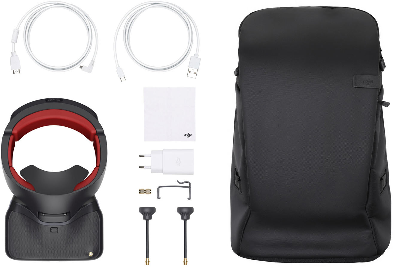 | Комплектация | Очки DJI Goggles Racing Edition + Carry More: / Крепление на голову / Кабель MicroUSB / Кабель HDMI / Антенна — 2 шт. / Reversed SMA Connector / Зарядное устройство / Зажимы / Очищающая ткань / Рюкзак Carry More / Документация |
