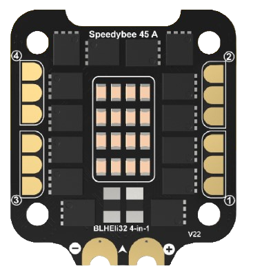 В конструкции контроллера SpeedyBee F7 V2 BL32 45A Stack предусмотрен 22-миллиметровый вырез для подключения FPV-камеры. Также здесь сеть гироскоп, размещенный в центре. С его помощью поддерживается более точный сбор данных о полете, а также обеспечивается плавная картинка во время съемки видео. Для достижения большей мощности в конструкции контроллера предусмотрен 21 конденсатор. За счет 811 сквозных отверстий удается достигнуть более быстрого прохождения тока.