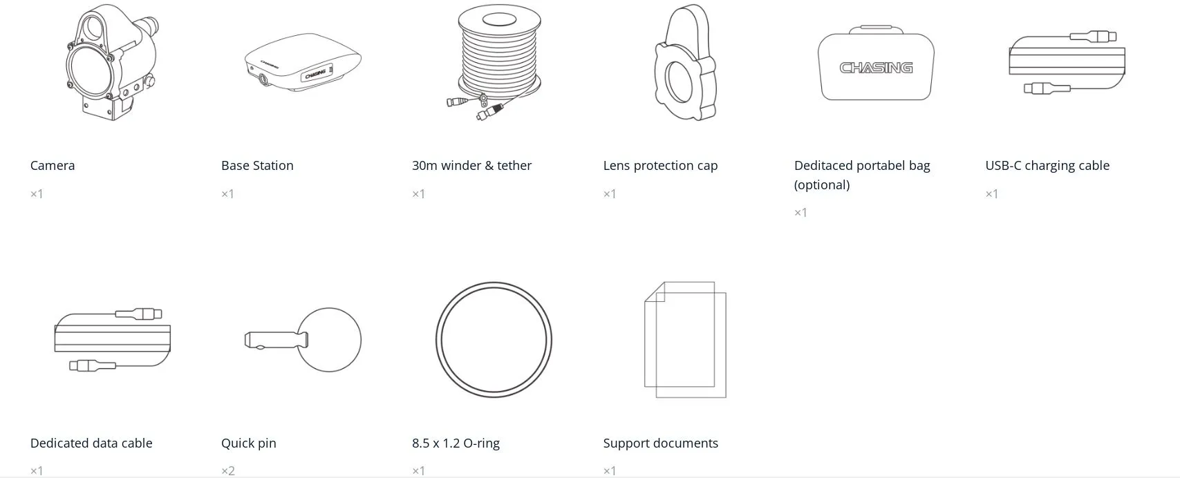 | Комплектация | Подводная камера Chasing CanFish CF1 (Standard) / Базовая станция ×1 / Кабель 30m winder & tether ×1 / Защитная крышка объектива ×1 / Зарядный кабель USB-C ×1 / Кабель для передачи данных ×1 / Quick pin ×2 / Уплотнительное кольцо 8,5 х 1,2 ×1 / Руководство |