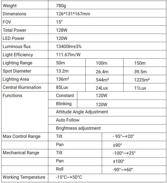 | Дополнительные возможности | Плавное линейная регулировка / Оптическая технология визуализации / Ультралегкий дизайн / Максимальный световой поток 13400 люмен / Уровень освещения 11 люкс в cветовом пятне диаметром 39.5 м с расстояния 150 метров / 3-осевой подвес, синхронизация с камерой |