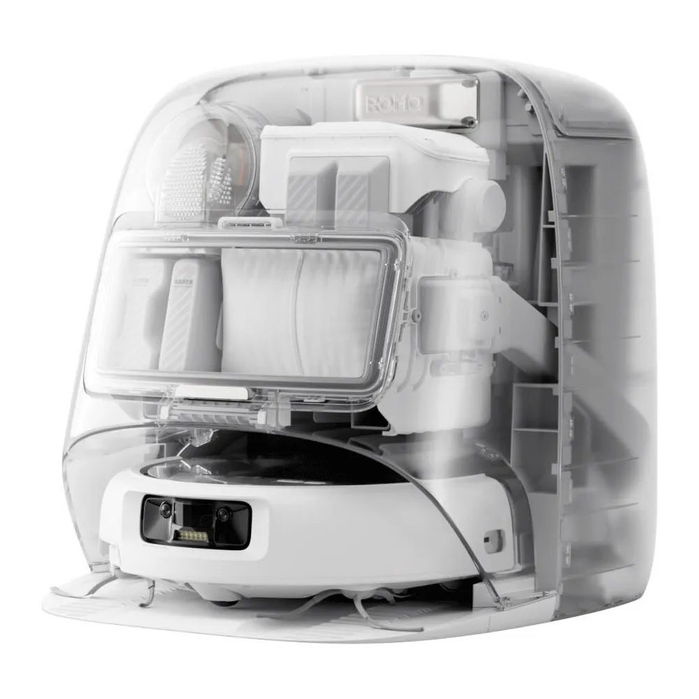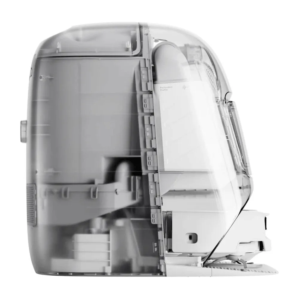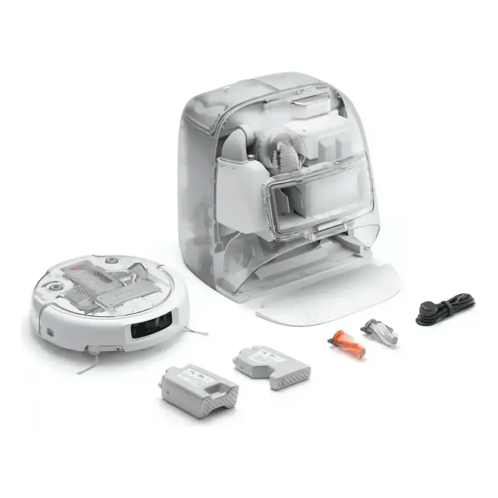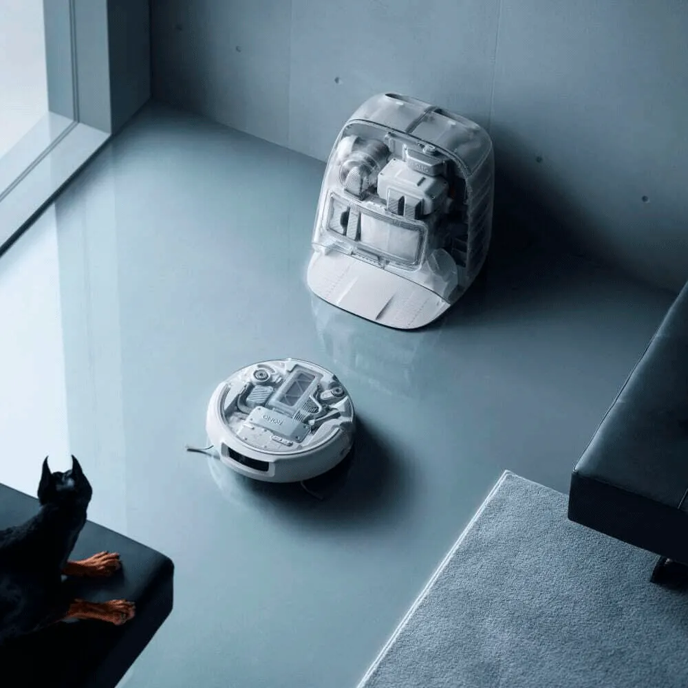 Станция берёт обслуживание на себя: горячая мойка промывает насадки, сушильный модуль убирает остаточную влагу, а пыль из контейнера робота автоматически сбрасывается в 2,4-литровый бокс. Раздельные баки — 4 л для чистой и 3,2 л для грязной — позволяют надолго забыть о сервисе. Прозрачный корпус подчёркивает точность механики, а трёхступенчатое шумоподавление делает работу практически незаметной для семьи и домашних животных.