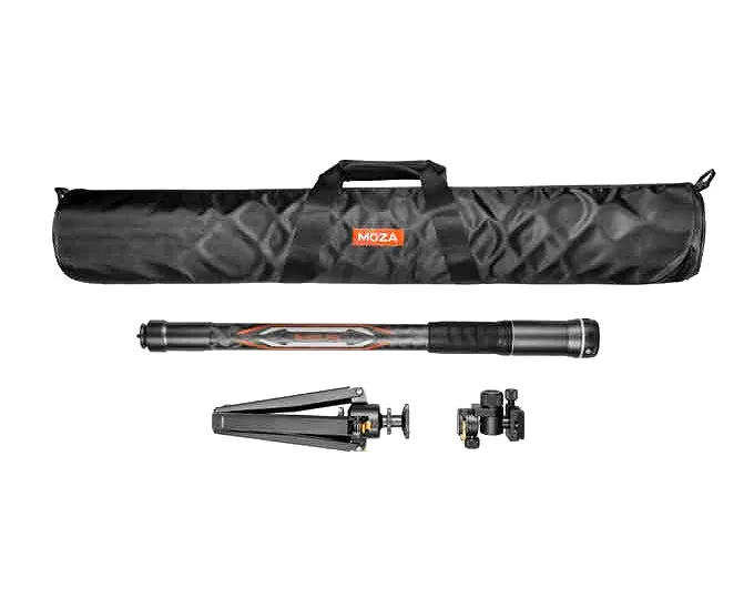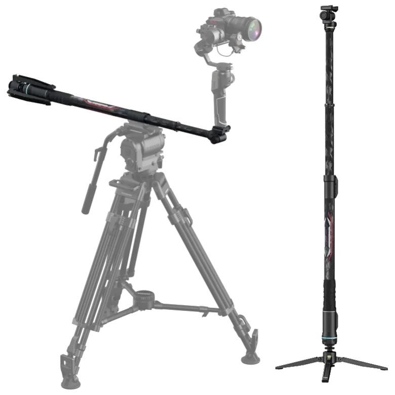 Устройство произведено из легкого, но прочного углеродного материала – карбона. Конструкция устойчива к воздействию воды и песка. Монопод имеет складную конструкцию и оснащен прочным триподом-основанием для самостоятельной установки на любой поверхности. Также монопод можно присоединить к штативу. Вес устройства всего 1460грамм, поэтому его можно брать с собой на любые съемки. В сложенном виде монопод помещается в рюкзак.