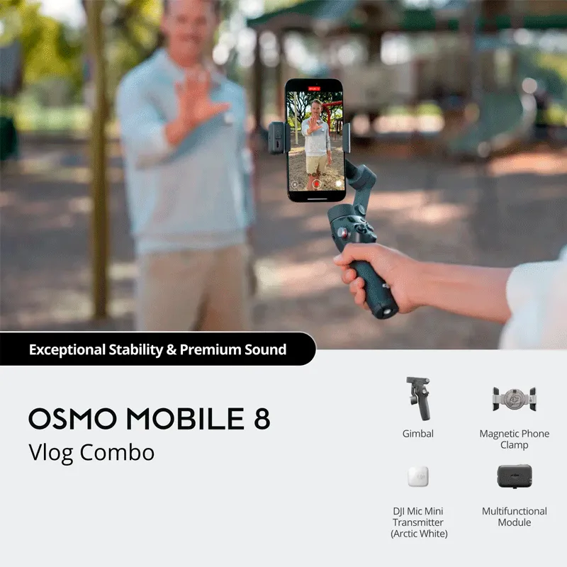 DJI Osmo Mobile 8 Vlog Combo — это профессиональный комплект для съёмки видео со стабилизацией и кристально чистым звуком. Он создан для блогеров, стримеров, журналистов и тех, кто хочет снимать динамичные ролики без дополнительной аппаратуры. Комплект включает стабилизатор Osmo Mobile 8 и беспроводной микрофон DJI Mic Mini Arctic White — идеально для съёмки влога, прогулок, интервью или прямых эфиров.