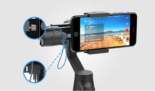 Дополнительные возможности | Полезная нагрузка: 300 г / Поддерживаемые размеры смартфона: 61 ~ 92 мм / Ось панорамирования: ± 360 ° / Ось наклона: ± 165 ° / Ось крена: 310 ° / Диапазон угловой вибрации: 0,02 ° / Емкость аккумулятора: 2100 мАч / Время работы: 10 часов / Вольтаж: 7,4 В / Время зарядки: 3,5 часа / Протокол Bluetooth: BLE 4.0 / Расстояние связи: 5 м / USB-вход: Micro USB / Выходной порт USB: Micro USB 5 В 500 мА |