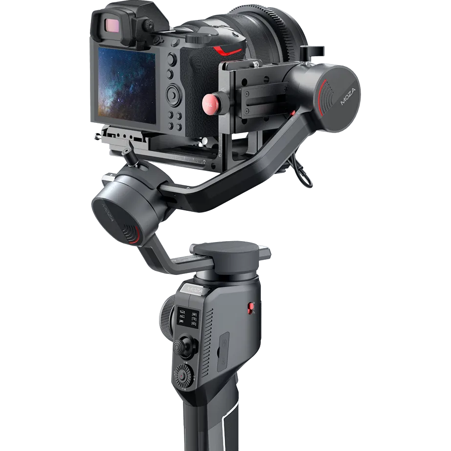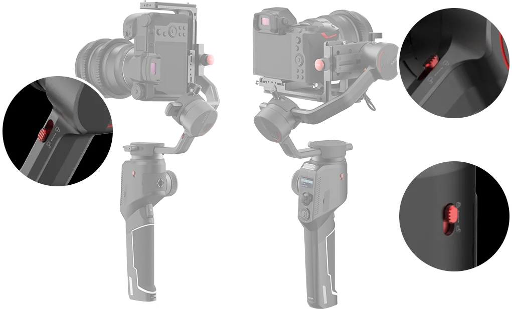 MOZA AirCross 2 поддерживает мимический контроль через смартфон, что делает управление камерой и стедикамом еще более удобным. Подвес будет повторять движения мобильного устройства - вращения, наклоны, повороты и др. Ручное управление реализовано через кнопки на рукоятке. Так, тройное нажатие на левую кнопку активирует режим FPV - вращение камеры на 360 градусов.