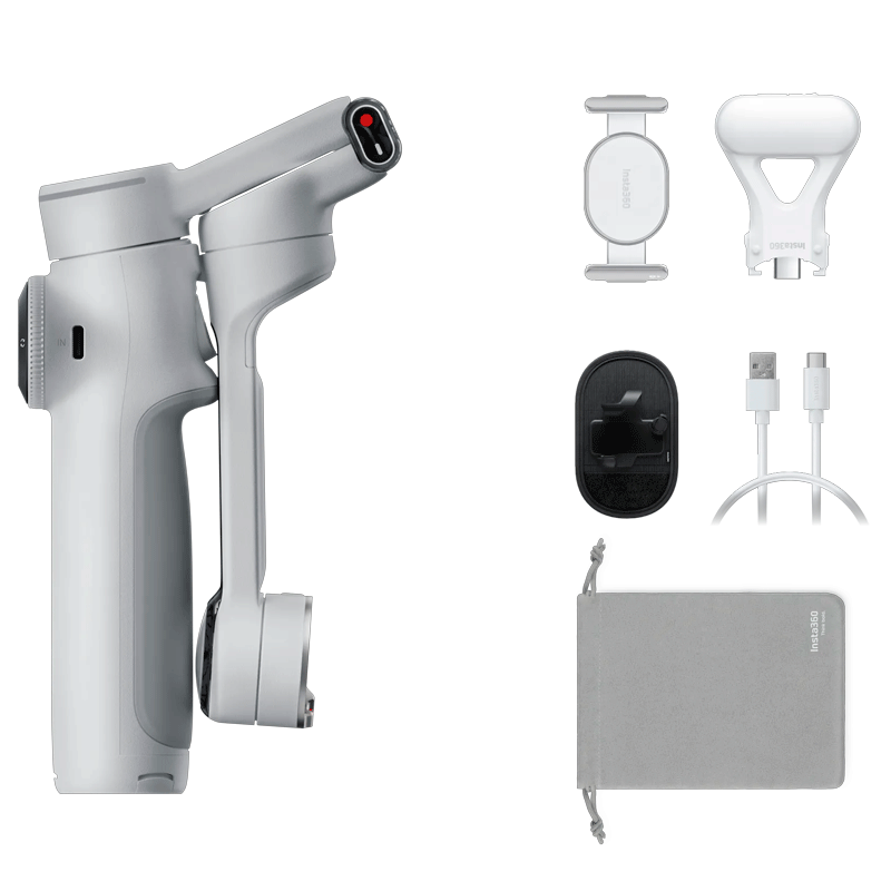 Комплектация | Стабилизатор Insta360 Flow 2 Pro / Магнитный зажим для телефона x1 / абель для зарядки USB-C - USB-A x1 / Защитный чехол x1 / Прожектор x1 / Крепление для рюкзака x1 / Встроенный штатив |